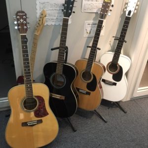 じゃじゃん!上の写真なんですが、新しいギターが並びました~(一番右の白い子です♪)
